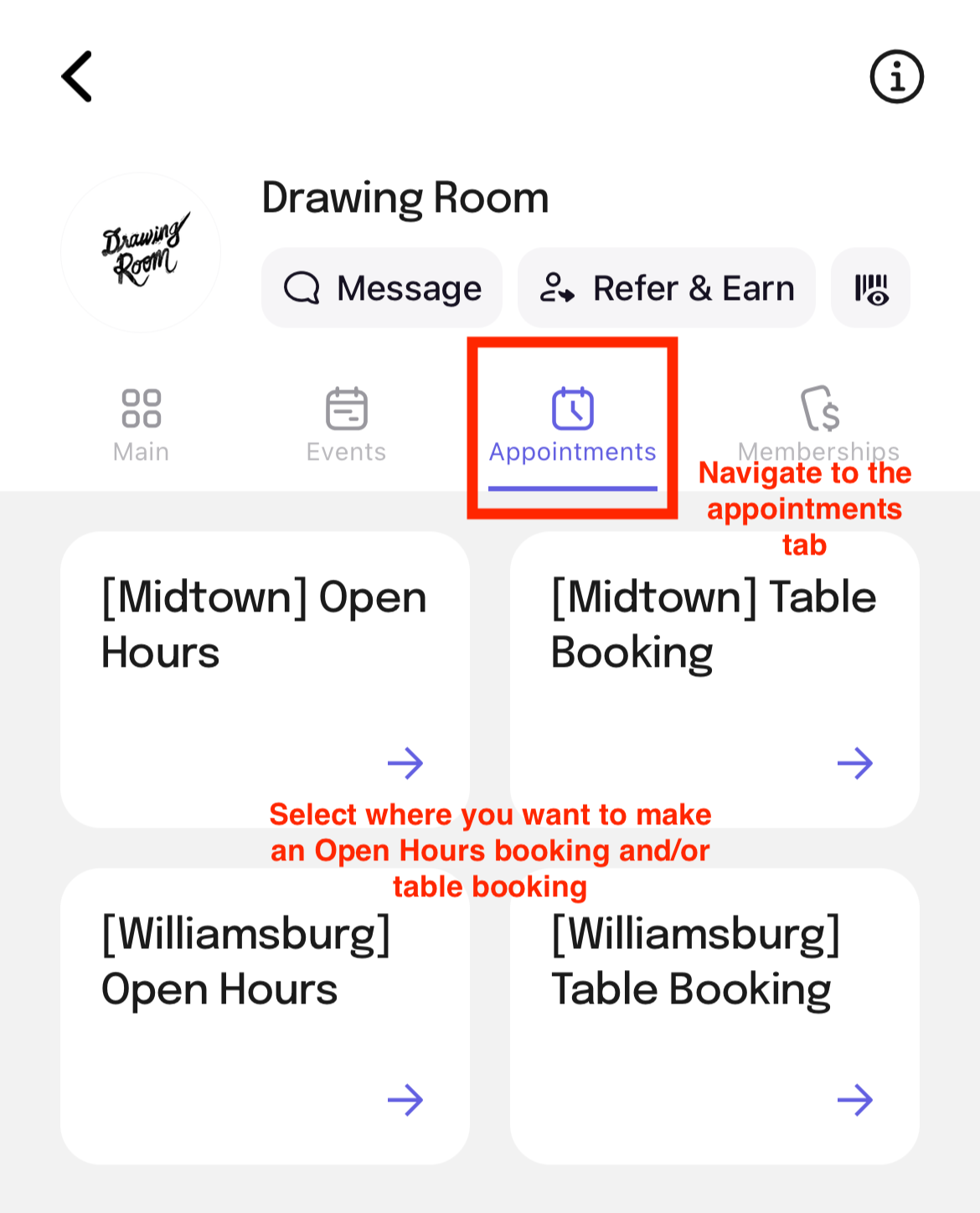 Go to your Drawing Room dashboard and navigate to the ‘Appointments’ tab. Select where you want to make your Open Hours or Table booking