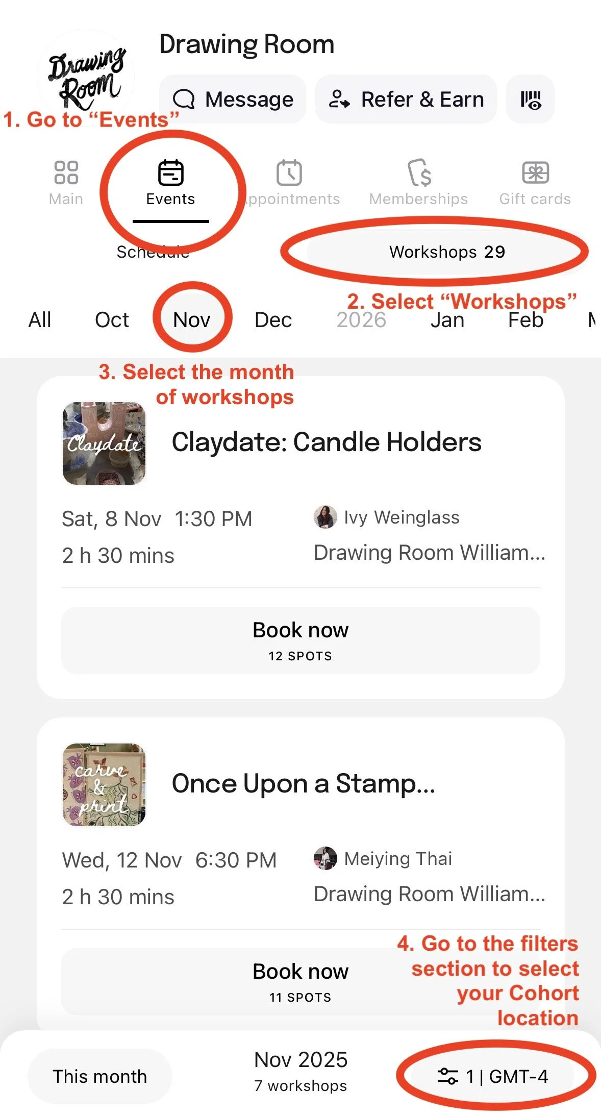 Navigate to the ‘Events’ tab. Scroll through to view upcoming workshops based on date and time. Instructor and location information is also listed.