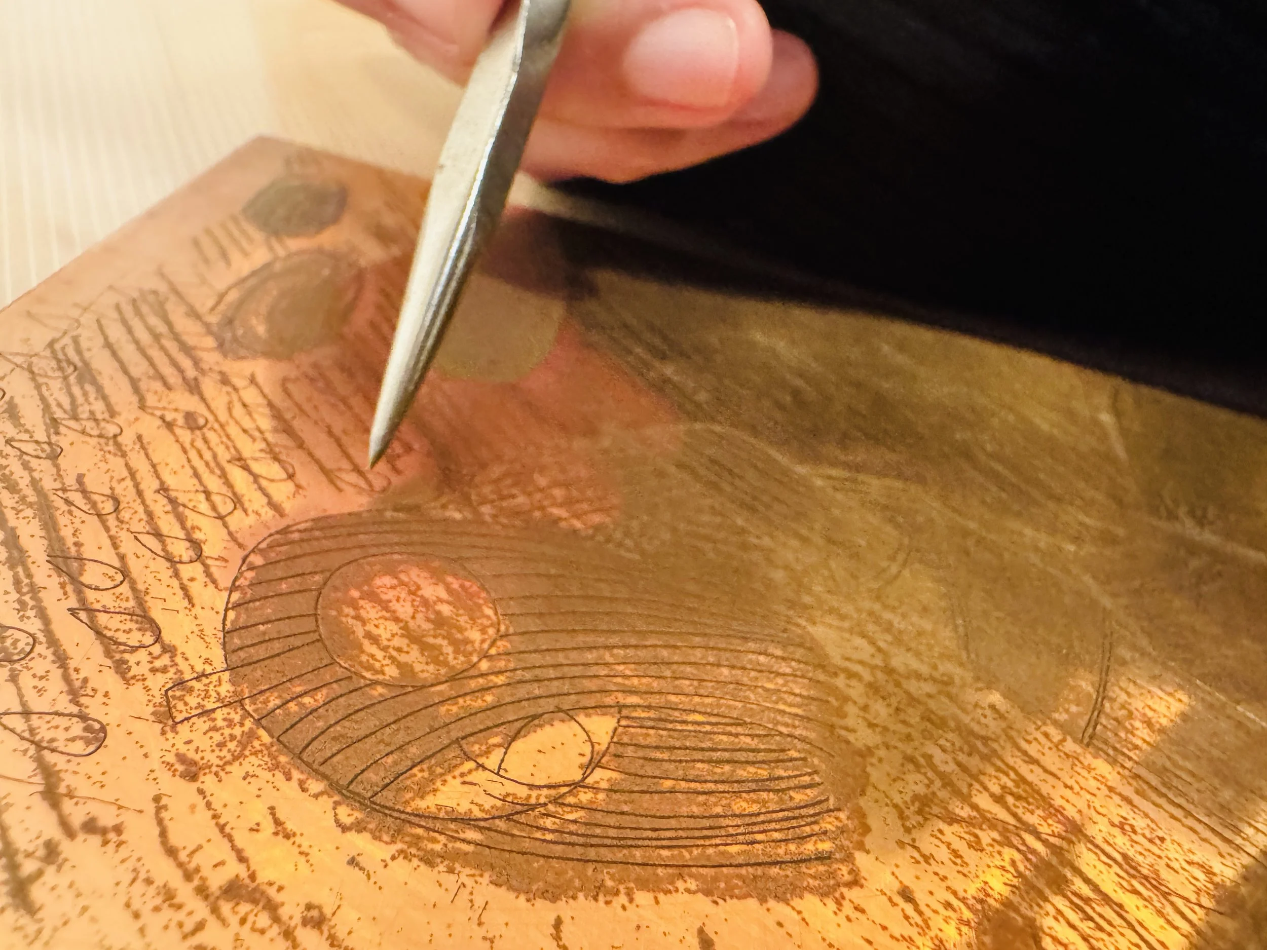 Switching gears, we’ll experiment with an intaglio method called drypoint on copper metal plates! This technique and material creates rich, velvety lines. A finished copper plate is often displayed as artwork itself, valued for its tactile beauty and the visible record it holds of the artist’s process.