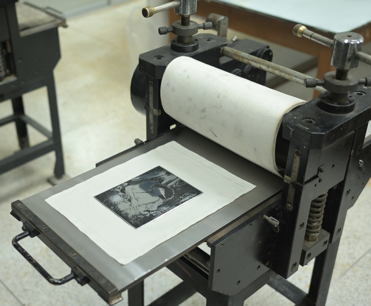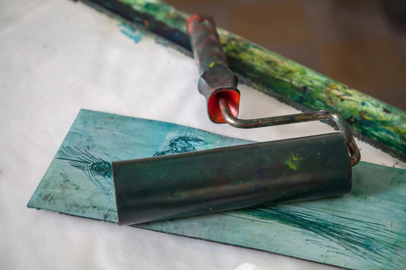 A printing press is a mechanical tool that evenly transfers ink from your plate to paper, creating crisp lines and rich textures that hand printing can’t always achieve. Turning the wheel and revealing a perfect impression is pure magic every time. Using the press connects you to centuries of artists and opens up new possibilities for depth, scale, and creative experimentation.